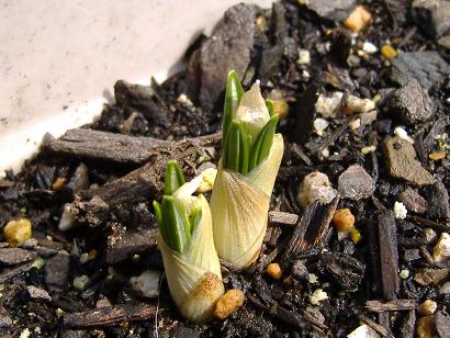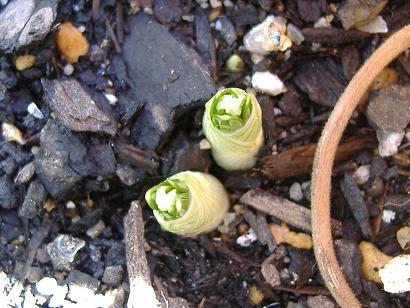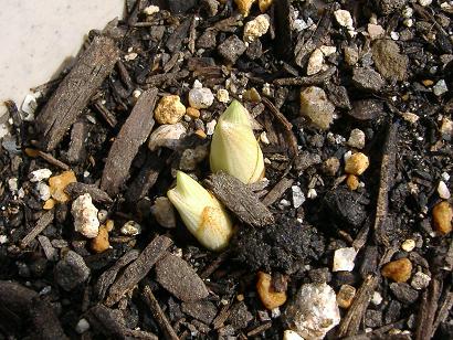 一番早いものでもまだ皮を破って葉は出てきてはいないのですが、まぁ此方はもっと暖かくなってきてから開花する筈ですから、心配しなくても良いような。- 3月4日
