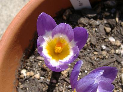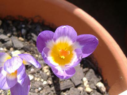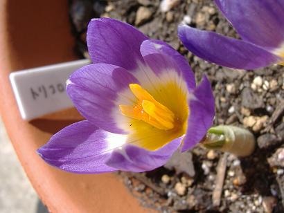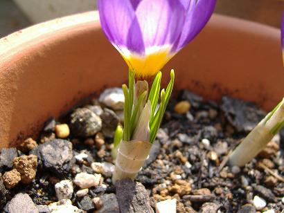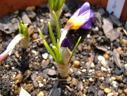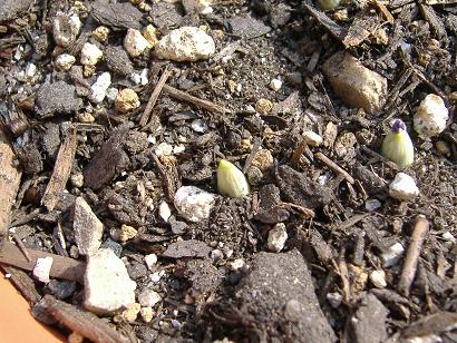 やっと地上部に芽が出てきました。右の方は蕾・・・になるのでしょうか。この種の花は紫色ですのでそれ自体は可笑しくないような、でも普通葉が出てから開花するはずですし・・・。クロッカスの中には葉より先に花が咲く種もありますが、これはそうではなかった筈。- 3月1日
