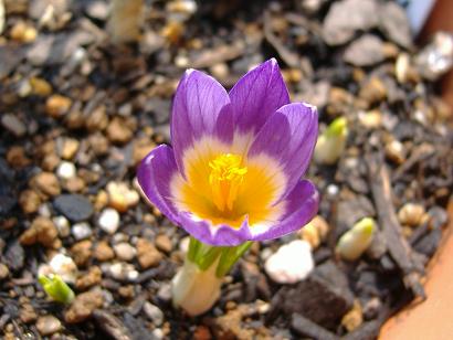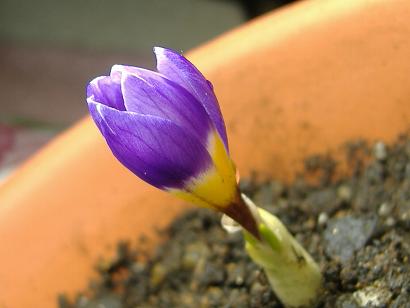家族が鉢をこかしたとか言うのでちょっと様子を見てみると、いつの間にか蕾が出てきていました・・・。それでよく観察しようと室内に取り込んだのですが、クロッカスの花が温度傾性ということを忘れてしまっていたために・・・○| ̄|_